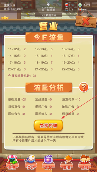 4、在餐厅营业栏内,可以看到今日的客流量信息,以及可以控制餐厅打烊和开店。