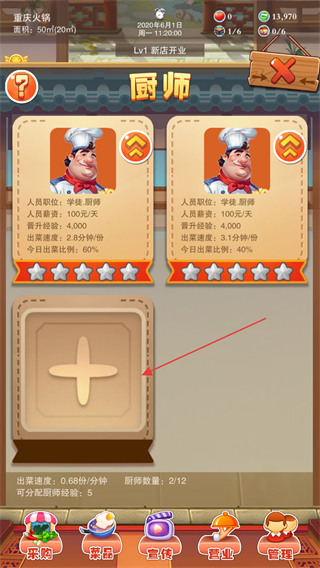 3、在管理界面可以点击厨师或服务员,点击加号键花费金钱聘请员工。