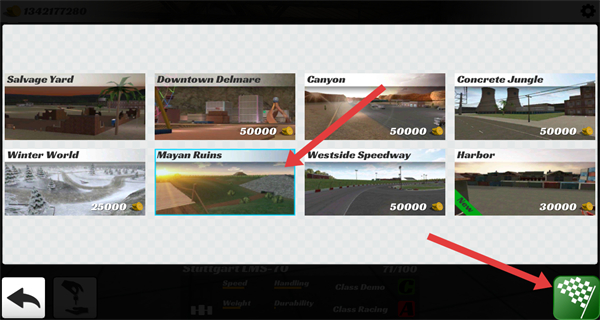 2、在赛道选择界面,选择目标赛道,点击右下角的终点旗按钮,进入对应赛道的比赛场景。
