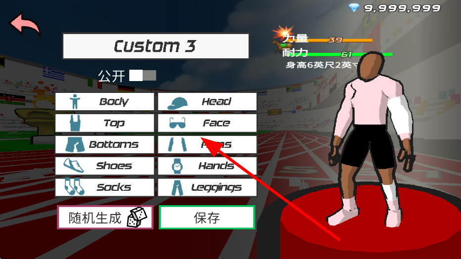 4、使用菜单生成无限钻石,对角色的身体、上衣、裤子、鞋子等多个部位进行购买装扮,打造出符合自己审美、独特的田径选手形象。