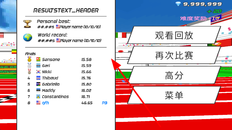 2、比赛结束后,可查看成绩界面,了解个人最佳成绩、世界纪录以及决赛中各位选手的成绩情况,总结比赛表现,为后续比赛积累经验。