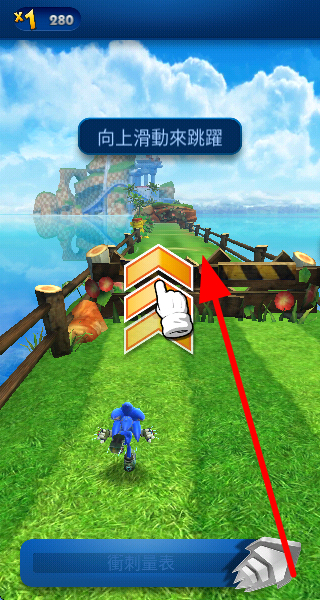 2、碰到需要跨越的障碍时,向上滑动屏幕,索尼克会跳起,越过障碍,保持前进,争取跑得更远。