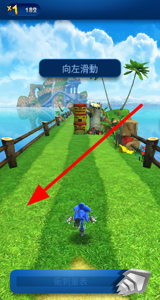 1、遇到岔路或障碍,向左滑动屏幕,让索尼克向左移动,避开阻碍,继续在跑道上奔跑,收集沿途道具。