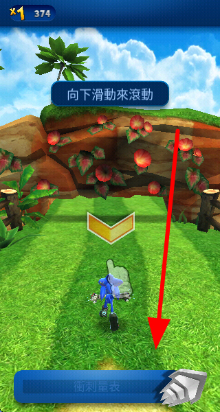 3、前方有低矮通道时,向下滑动屏幕,索尼克会滚动起来,穿过通道,避免碰撞,持续向目标前进。