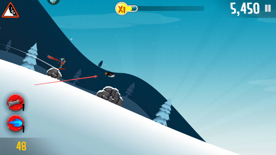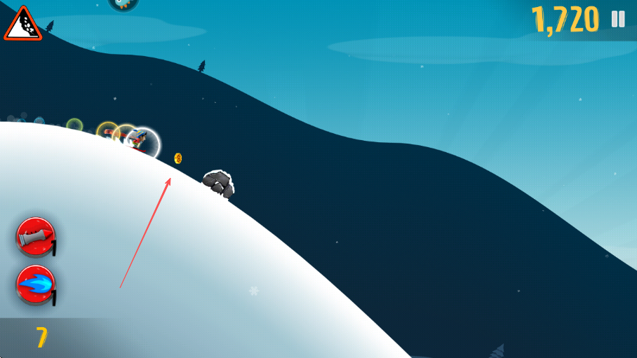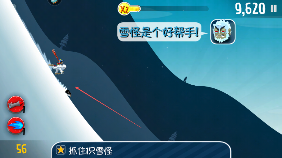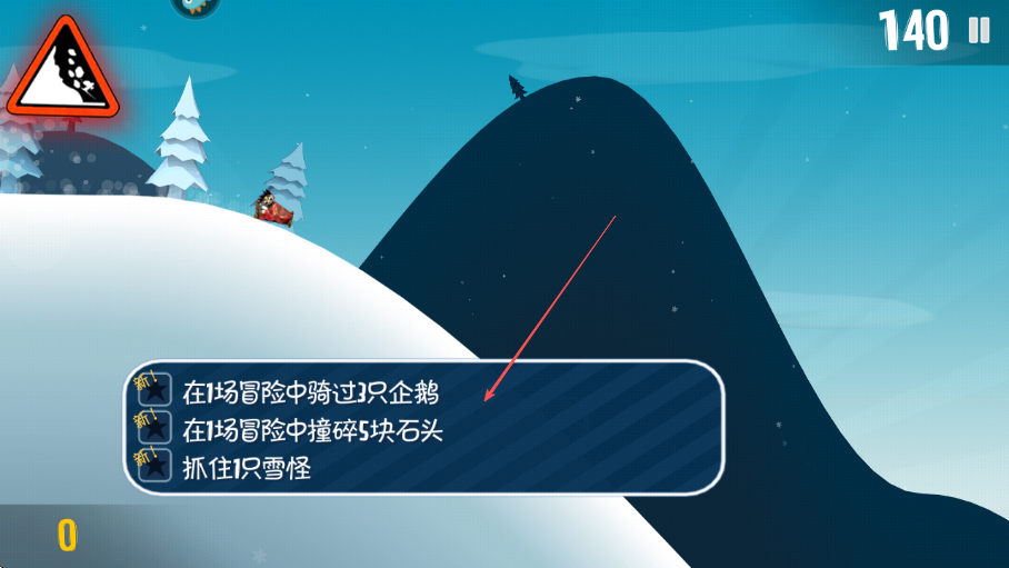 1、游戏开始留意屏幕提示任务,如在1场冒险中骑过1只企鹅,在1场冒险中撞碎5块石头,抓住1只雪怪。