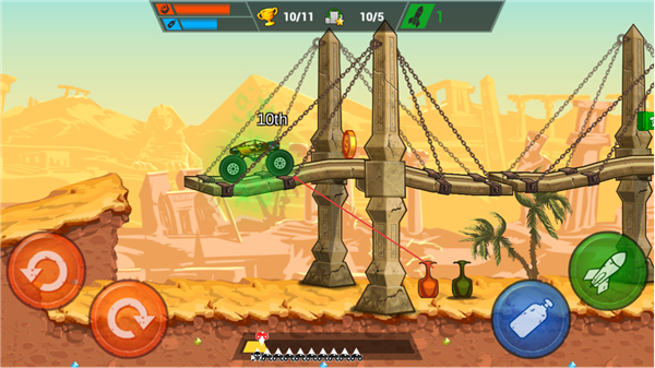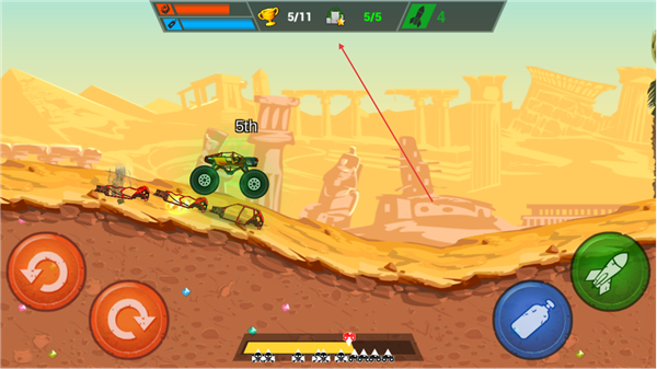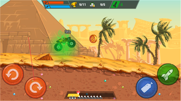 卡车自动行驶,左手操控前后翻滚键调整车身姿态,右手掌控喷气键与发射键,简单两键操作即可完成特技飞跃与道具攻击,新手快速上手。