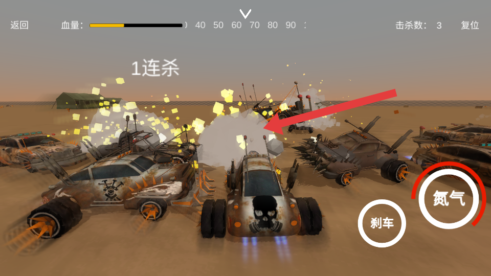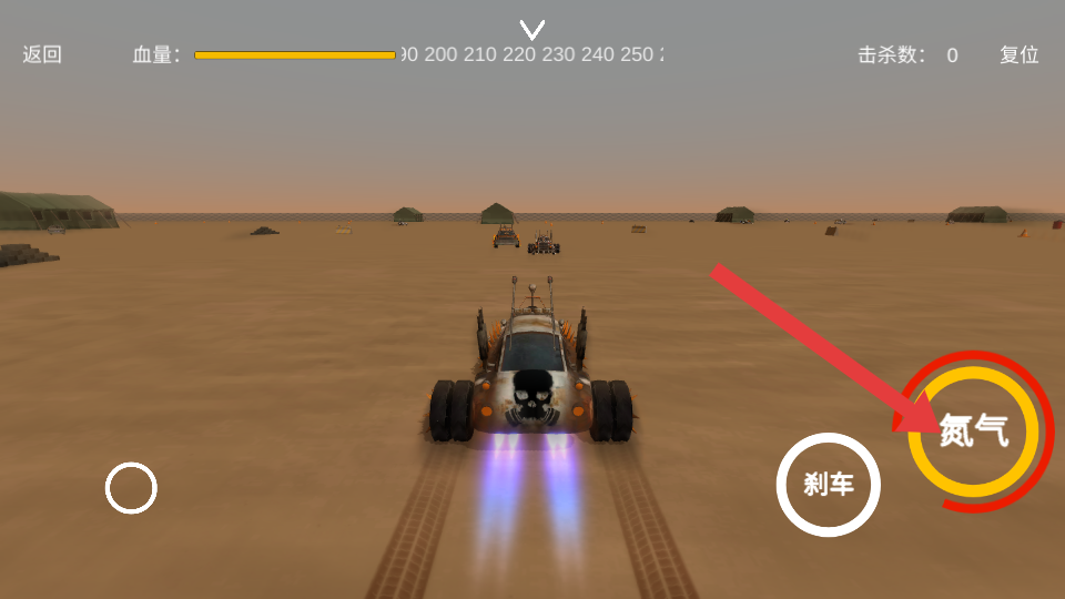 4、通过氮气加速突破敌方包围、刹车调整位置等操作,不断撞击敌方车辆,快速积累击杀数,以此最快速度获取升级经验,实现快速升级。