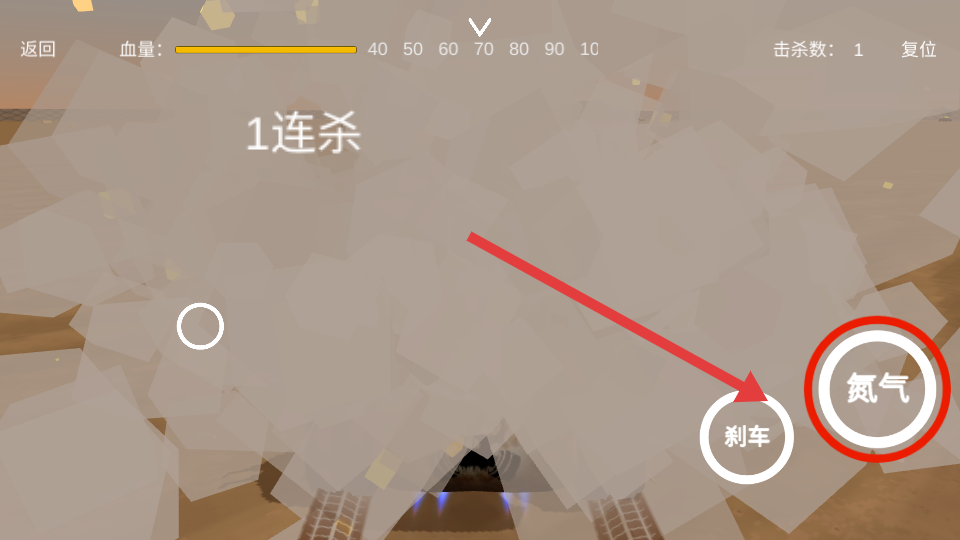 2、第一时间点击右侧氮气按键,借助氮气加速效果,瞬间切入敌方车辆群,一次性撞击多辆敌方车,高效提升击杀效率以获取更多经验。