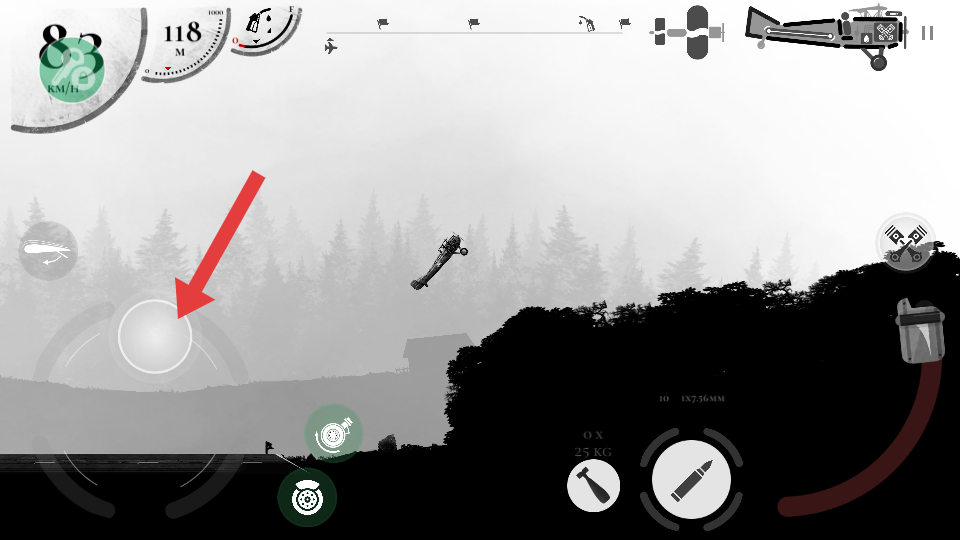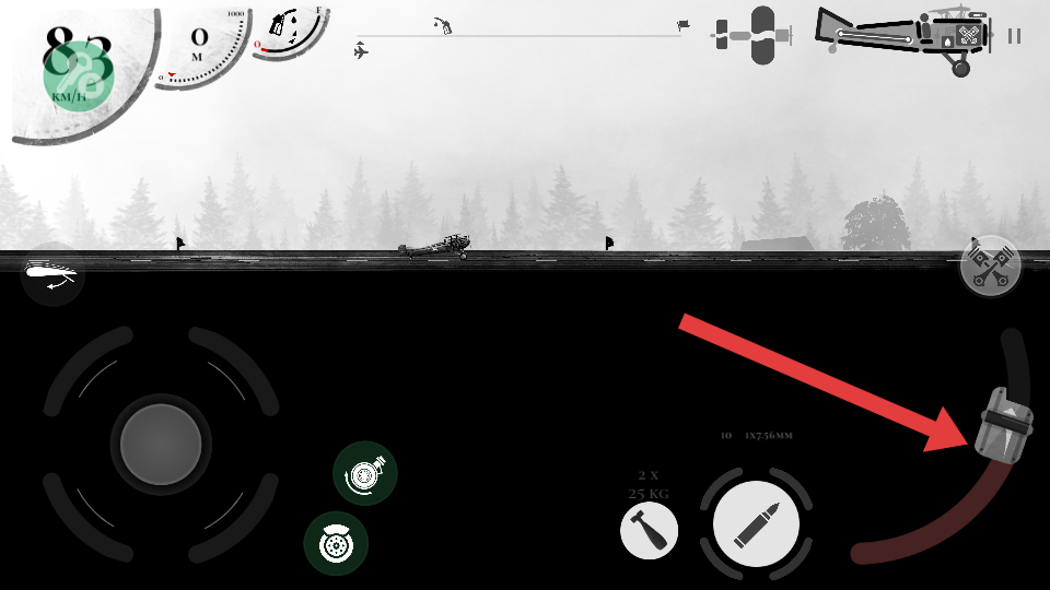 2、当发现敌机时,点击右侧子弹图标,向敌机发起射击,同时通过左侧操控区域灵活调整战机方向,追踪敌机,提高射击命中率。