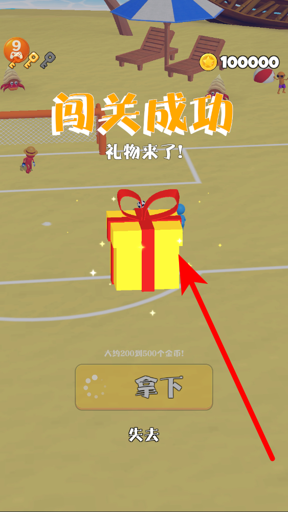 3、接着领取闯关奖励,当成功闯过关卡后,会出现闯关成功的提示,同时会有礼物奖励,点击拿下,就能获取这份奖励,奖励中包含一定数量的金币等物品。