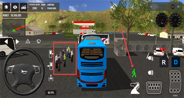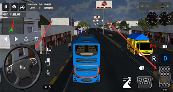 4、通过左侧方向盘控件控制巴士行驶方向,结合右侧的档位、油门等控制键,操控巴士沿路线行驶,完成行程任务。