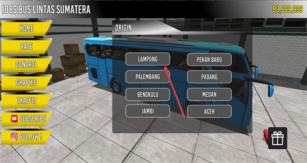 2、在路线选择界面,选择出发城市如“LAMPUNG”,确定本次巴士行程的起点。