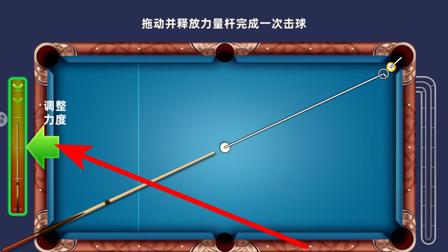 2、调整击球力度需拖动力量杆,根据击球的需求,调整好合适的力度,然后释放力量杆完成一次击球,控制台球的运动轨迹与力度。