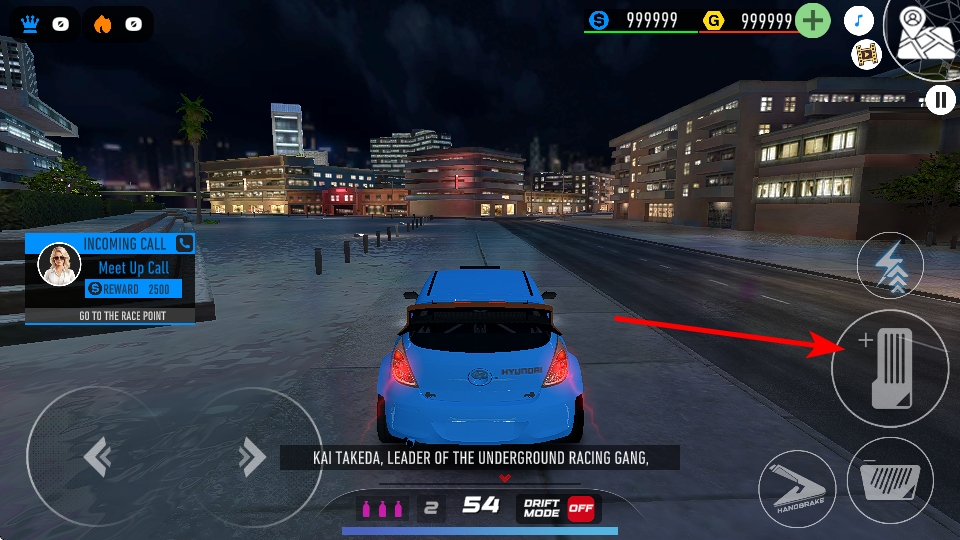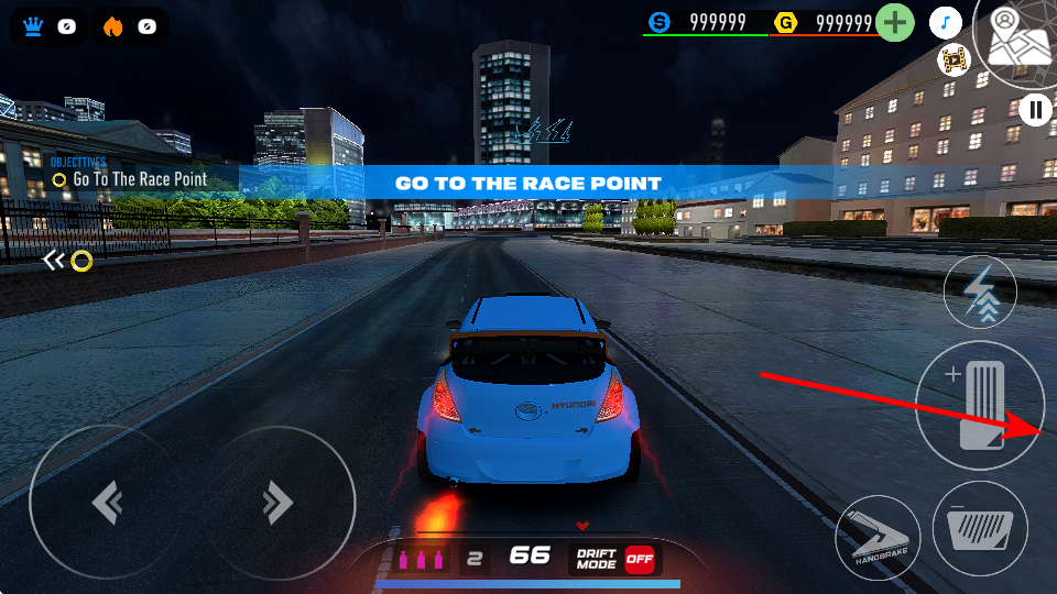 3、掌握加速操作,在城市赛道中,点击右侧的加速按钮,提升赛车速度,前往比赛点。