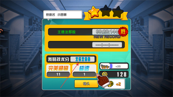 4、跑完赛场全程后,系统会根据技术分来给出星级评分,并判断你的胜负。