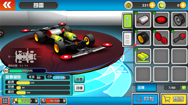 1、开始比赛前,需要对赛车进行改装,选择更先进的装备提升赛车性能。