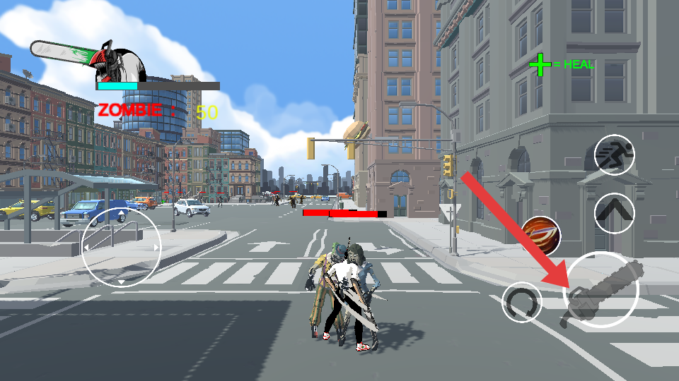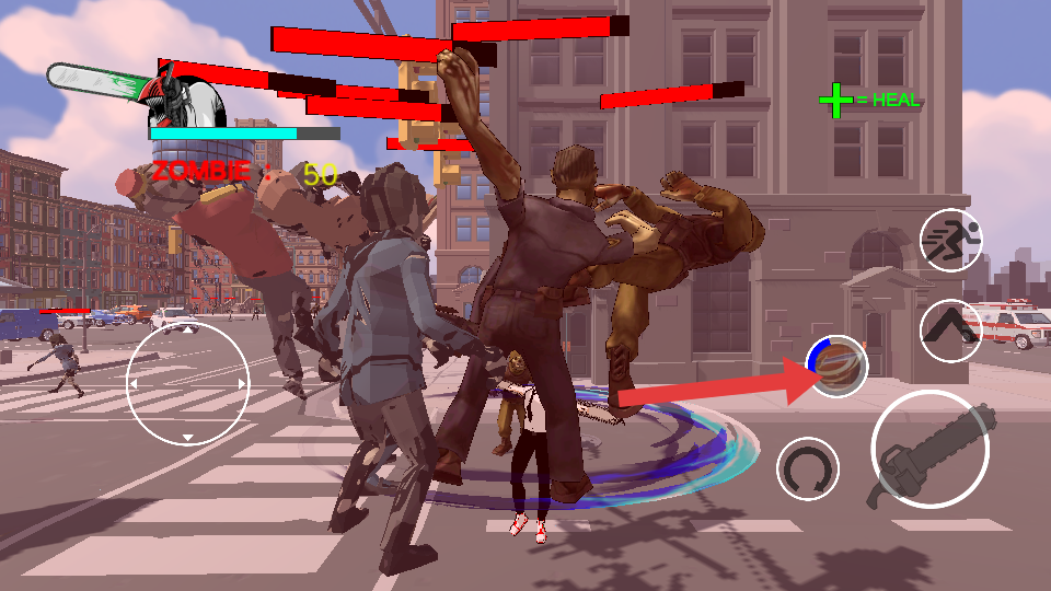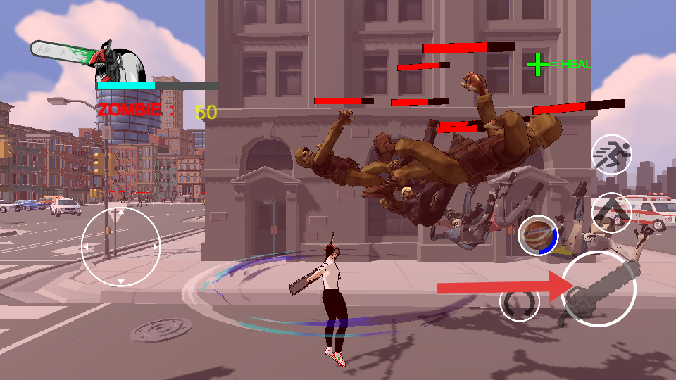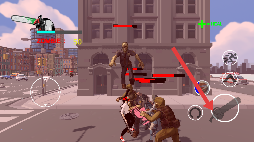 2、角色操控与战斗执行:战斗过程中,通过虚拟按键控制角色上下左右移动,避开僵尸攻击;点击跳跃或翻滚按键躲避危险,同时用攻击按键发起连击。