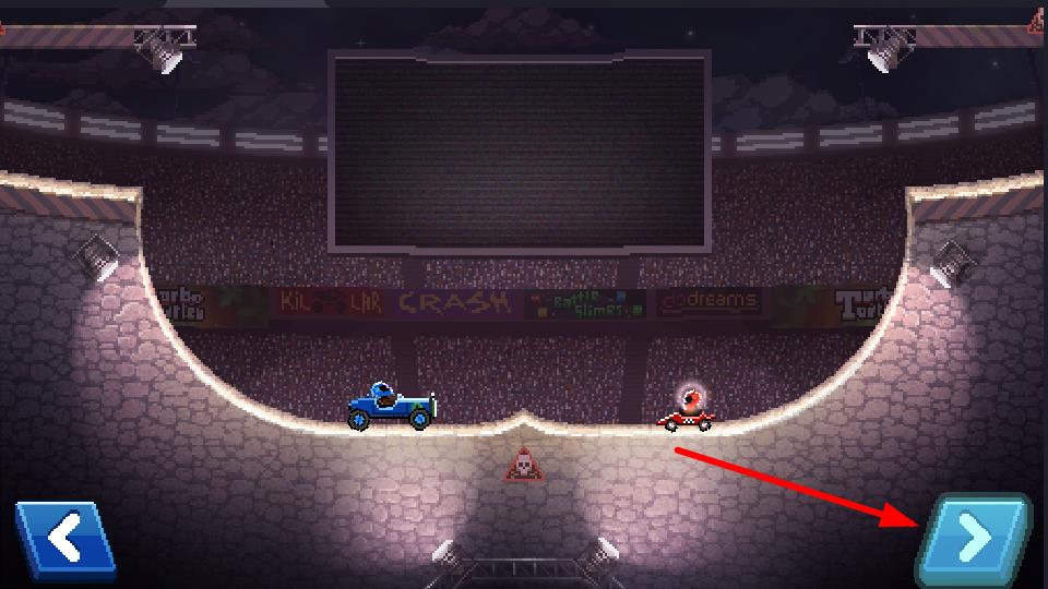 1、点击右侧箭头按键,可控制车辆前进,在竞技场地中向对手发起冲击,是发起攻击基础操作。