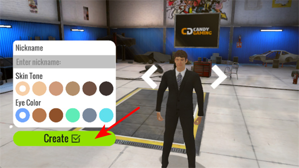 1、在角色创建界面,先设置昵称,再选择肤色、eye颜色等外观选项,调整完后点击Create按钮完成角色创建,进入主玩法场景。