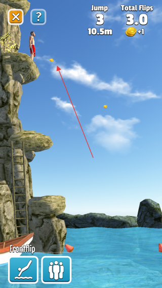 1、角色站悬崖边,点击Frontflip按钮,朝着金币方向起跳。