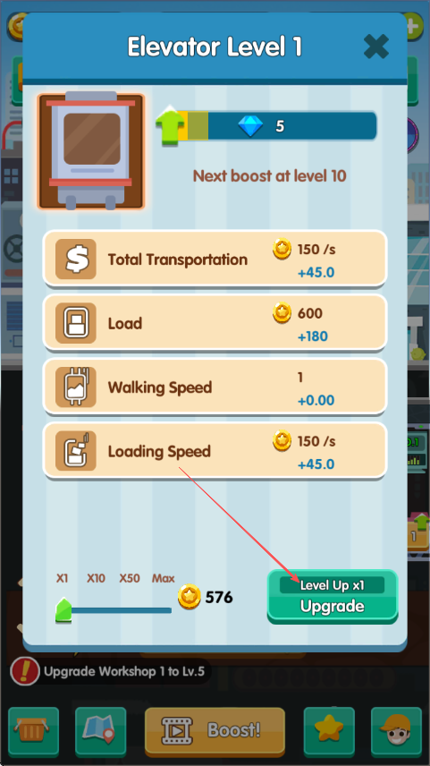 2、点击电梯图标,查看运输、负载等数据,花费资源点击Upgrade升级电梯。