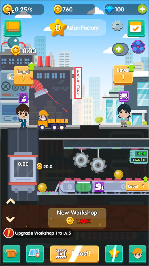 1、进入体育帝国大亨游戏界面,留意金币钻石数量,看到升级提示,优先按要求升级车间。