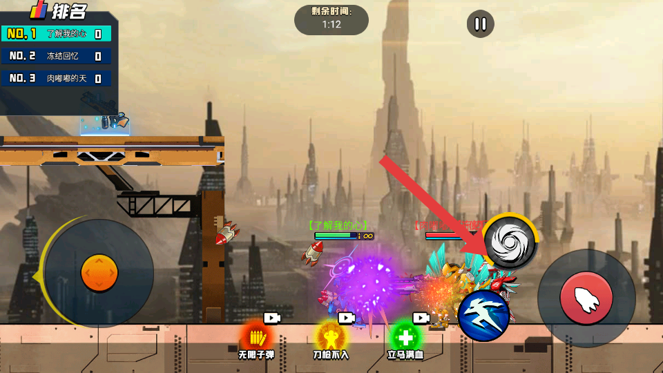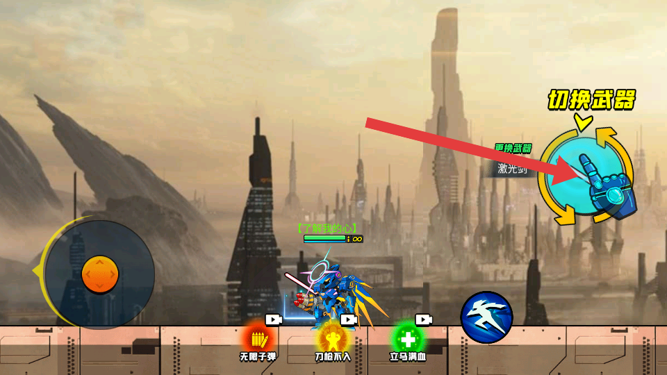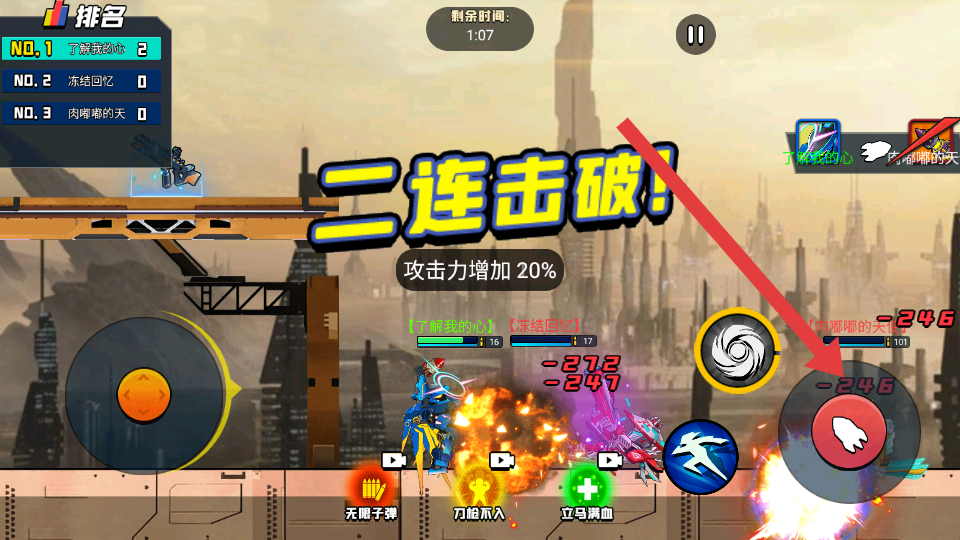 2、战斗过程中留意每个按键的功能,可运用升级机甲的攻击力、防御力等各项属性,点击释放能量。