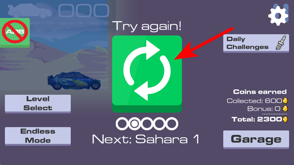 4、若车辆损坏导致游戏失败,点击重来按钮重新挑战当前关卡,通过不断尝试优化驾驶技巧,提升游戏表现。