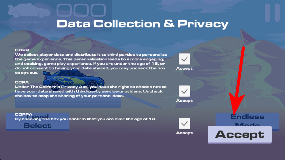 1、进入游戏界面后,点击Accept按钮确认隐私条款,这是进入关键操作,准确点击才能解锁驾驶场景。