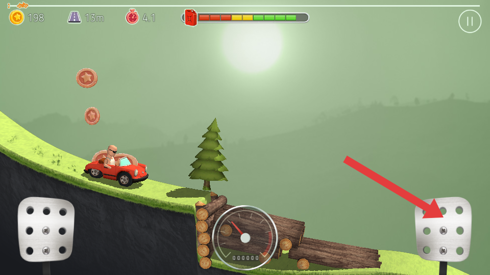 1、在车辆行驶到有原木障碍的路段时,点击箭头指向的右侧油门按钮,控制车辆加速,助力车辆越过原木障碍,继续前行。