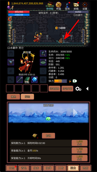 2、战斗中击败怪物如口水蜗牛可获取金币奖励,击败时需确保技能命中,积累用于道具炼制角色强化。