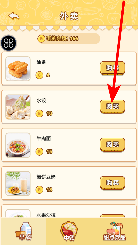 4、获得金钱后,可进入外卖等功能界面,挑选喜欢的物品,点击购买按钮,用获得的金钱购买这些物品,丰富模拟生活。