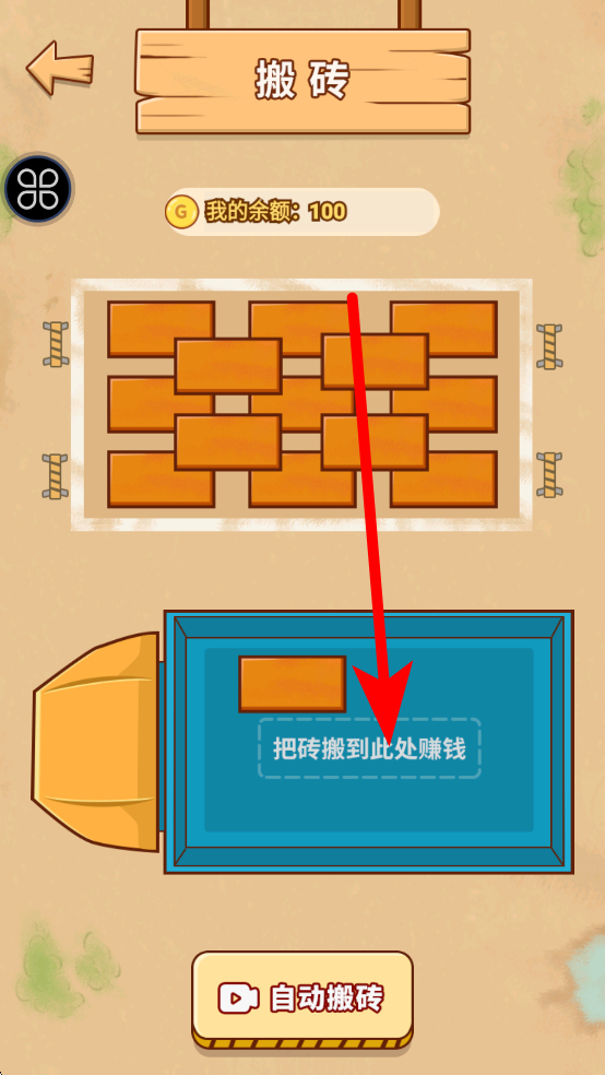 3、想获取金钱,可选择搬砖相关功能,按照提示把砖搬到指定位置,完成搬砖任务后,就能获得相应的金钱奖励。