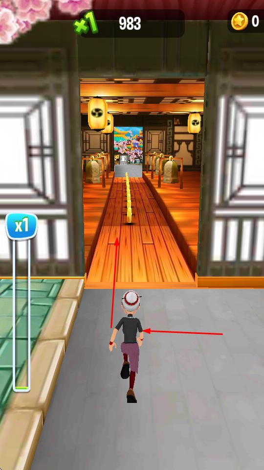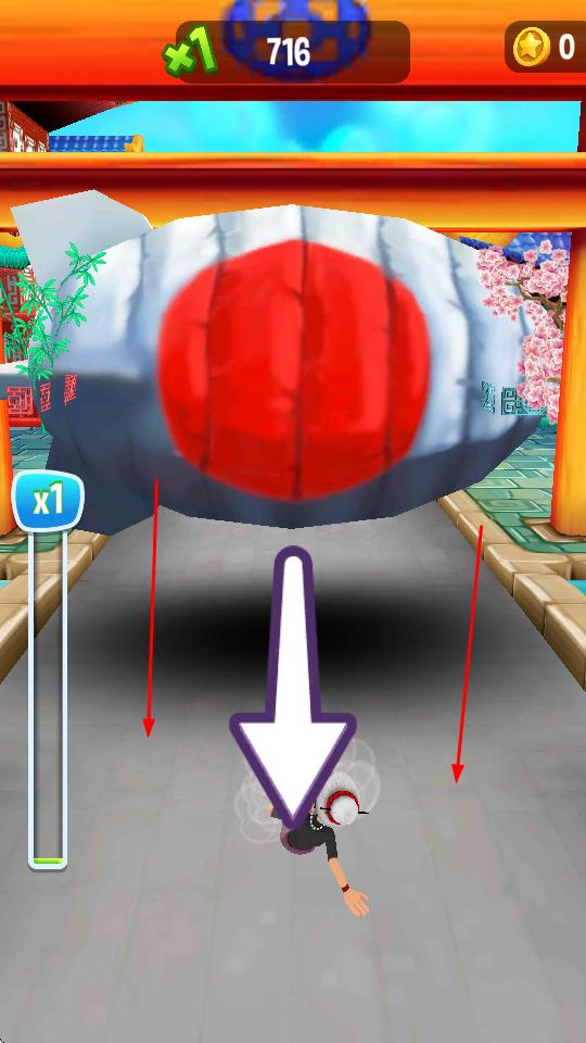 2、碰到大型灯笼类障碍时,及时向下操作避开,避免被阻挡,持续推进跑酷进程。