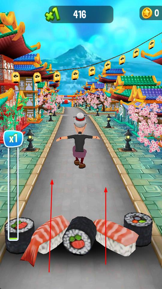 1、操控角色在日式风格街道跑酷,遇到寿司等障碍时,左右移动躲避,保持跑酷节奏。