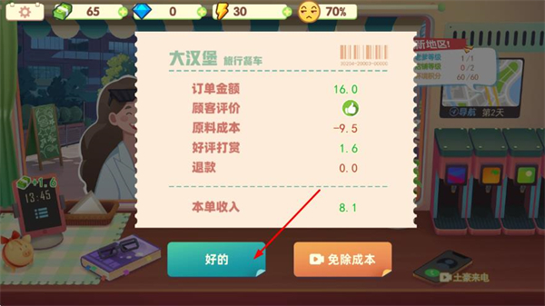 4、完成订单后查看收入详情,利用金币钻石采购更多食材、升级餐车设施,拓展经营区域。