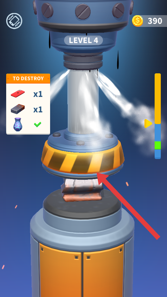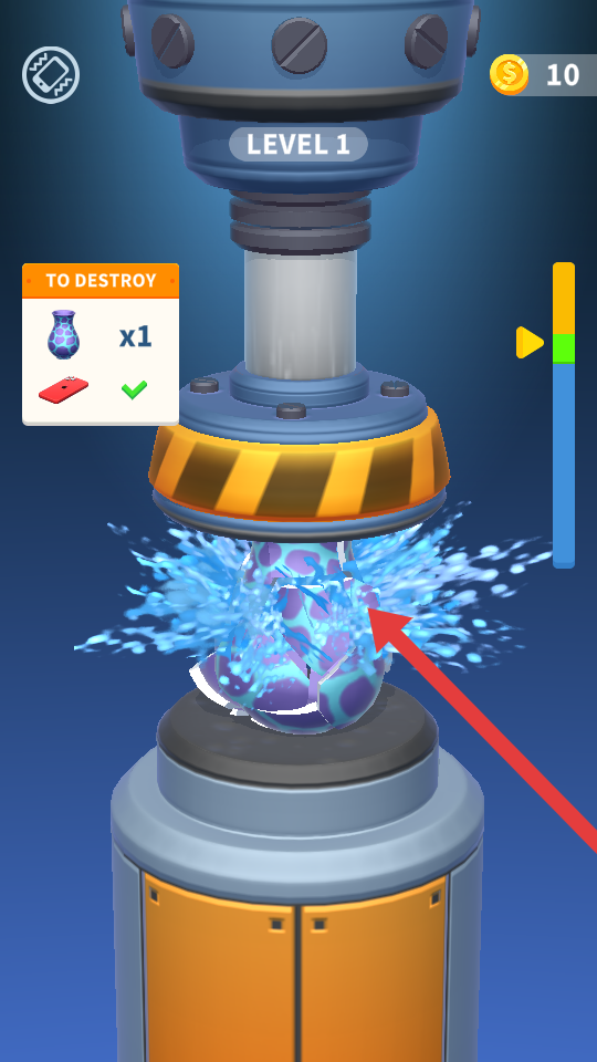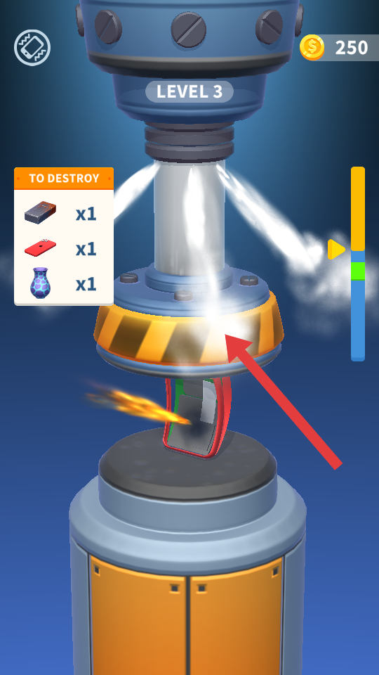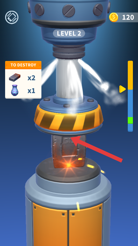 2、Level2时,依次破坏2个金属块和1个花瓶,注意液压机的下压节奏,确保每个物体都被完全破坏。