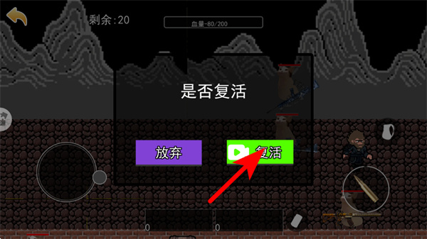 3、紧跟红色箭头指引,若角色生命值耗尽,点击复活按钮继续游戏,避免关卡进度丢失,推进冒险流程。