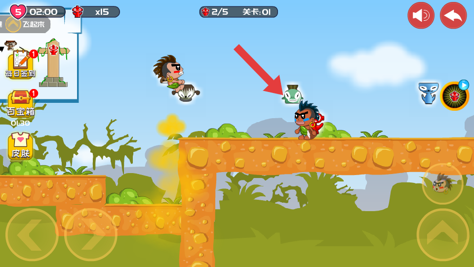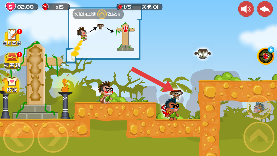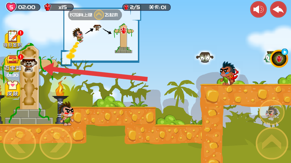 3、场景互动与闯关:在雨林用屁力吹散毒雾、驱赶藤蔓,在洞穴控制屁力反弹于岩壁避开岩浆,在火山推动滚石封堵火山口,完成场景的互动并寻找图腾。