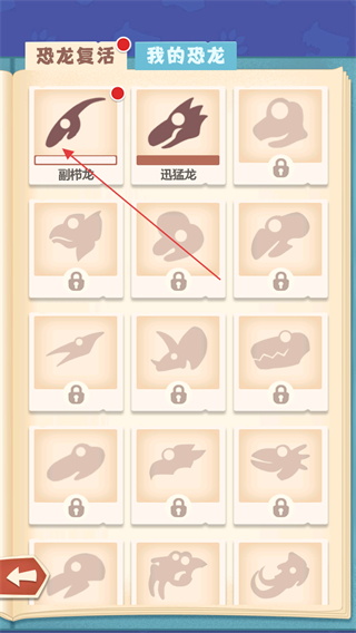 2、在图鉴中的恐龙复活页面,找到进度条满的恐龙图片进行点击。