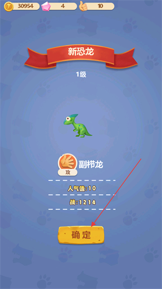 4、成功复活出新的恐龙,下方可以查看恐龙的详细信息以及攻防属性,点击确定按键将恐龙运到公园。