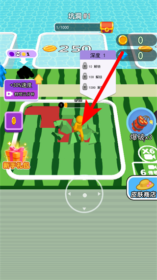 2、操控黄色小人角色进行挖矿,挖掘过程中可提升坑洞深度。