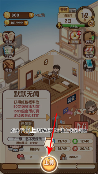 3、当小说创作到一定阶段后,点击上传按钮,可将小说上传到网站,提升作品的曝光度和影响力,推进游戏内的创作进程。
