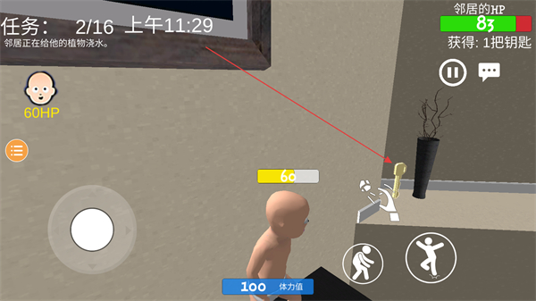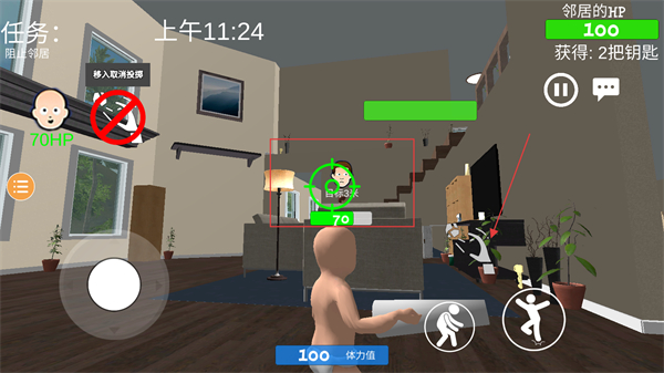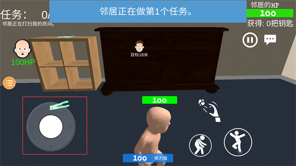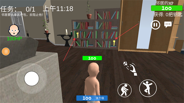 2、在场景中寻找金色钥匙,如书架、角落等位置,同时要阻止邻居完成任务。