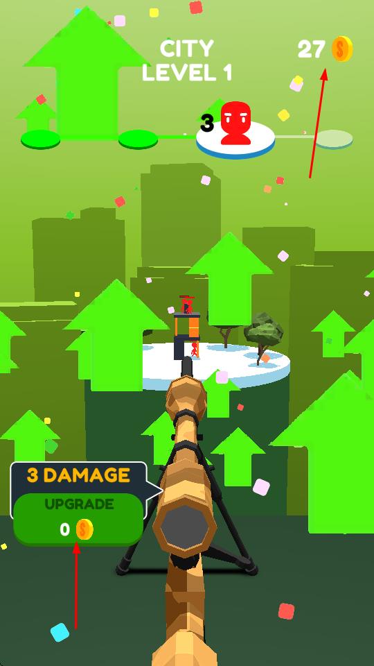 3、利用收集的金币点击UPGRADE升级武器,提升伤害,增强射击能力。