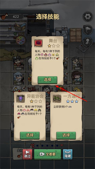 4、解锁技能选择界面,挑选舞台、异能协会等技能,提升基地生存效率。