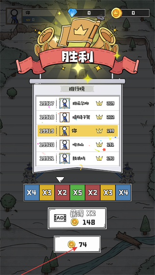 4、战斗胜利后,会提升玩家的排行榜名次,点击下方按钮可以领取通关金币。