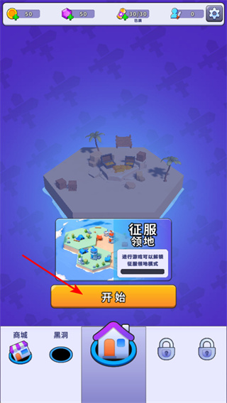 1、游戏中点击开始按钮,可进入征服领地的黑洞吞噬关卡,这是关键操作,点击后将开始挑战吞噬任务。