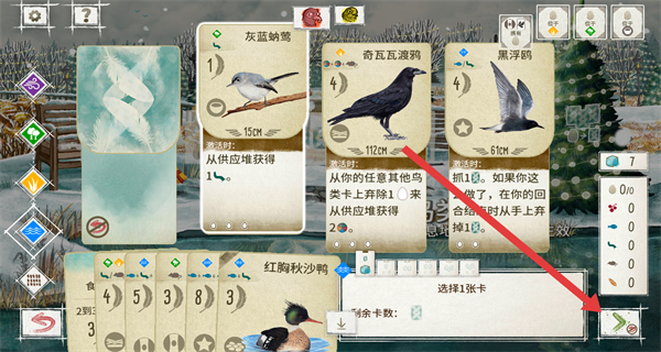 4、在抽取的鸟类卡中选择1张卡,点击确认按钮完成选择,后续可利用鸟类卡的能力获取资源、扩展栖息地。