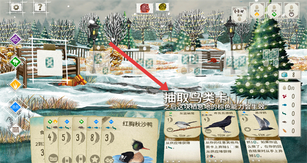 3、进入场景后,按提示点击抽取鸟类卡,抽取后对应的栖息地棕色能力会生效,可积累资源或触发对应效果。